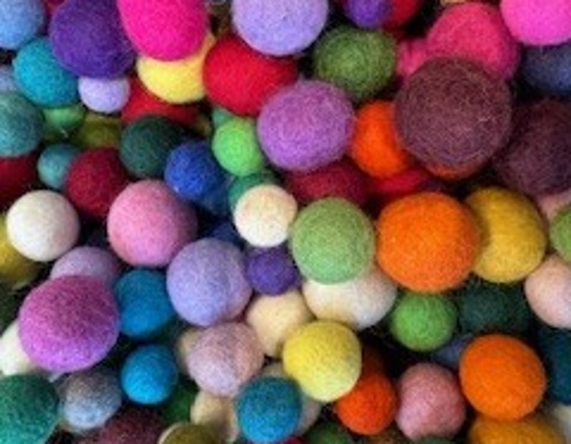 With an extensive selection of felt balls, come and choose your favourite colours to make a garland/hanging to add some fun and colour to a corner of your house, or perfect as a gift for a nursery or to decorate a classroom..
